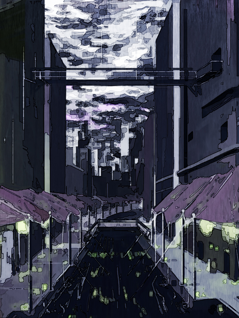 ということで(?)、考えるのは大分前に雨が降り続けた日に描いてたけど描きあがらなかった街の絵から、常に雨降ってる地域の街はどんな感じかね、ってので作りたい。(という目標)